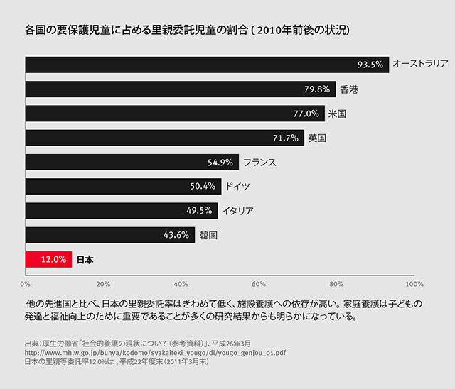 ところが日本では、約3万9000人(2013年)の「代替的な家庭」を必要とする子どものうち、里子として家庭に受け入れられている子は15%に満たない。9割近くが乳児や児童養護施設など施設に入所しているのが現状だ。養子という形で新たな家庭で暮らせることとなった子どもは303人(2011年、児童相談所経由)にとどまる。