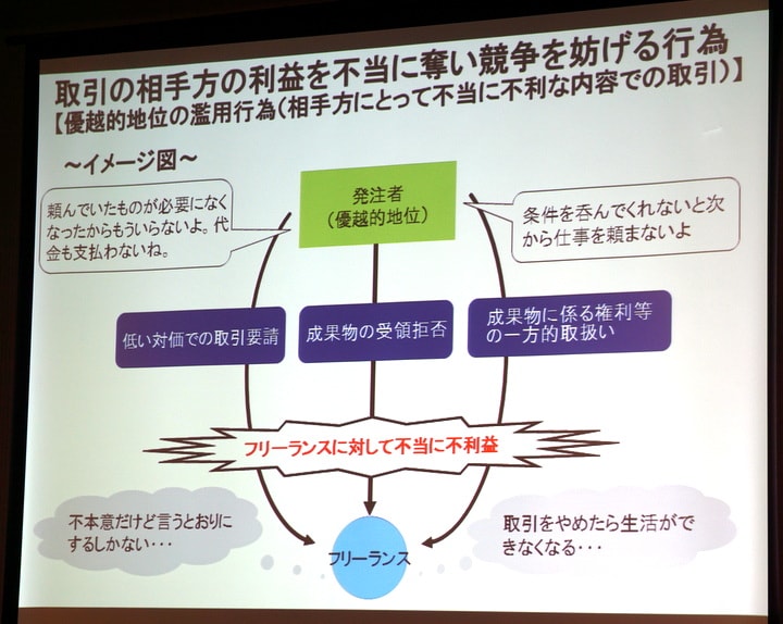 フリーランスに関しては、発注者が、虚偽の取引条件を提示して、ほかの発注者との取り引きを妨げることになる場合も、独禁法上、問題になる場合があるという。