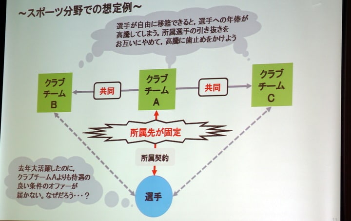 (1)の共同行為で問題になりうるのは、どんな場合か。たとえば、スポーツ分野で各チームが選手の引き抜きをやめると取り決めてしまう場合だ。